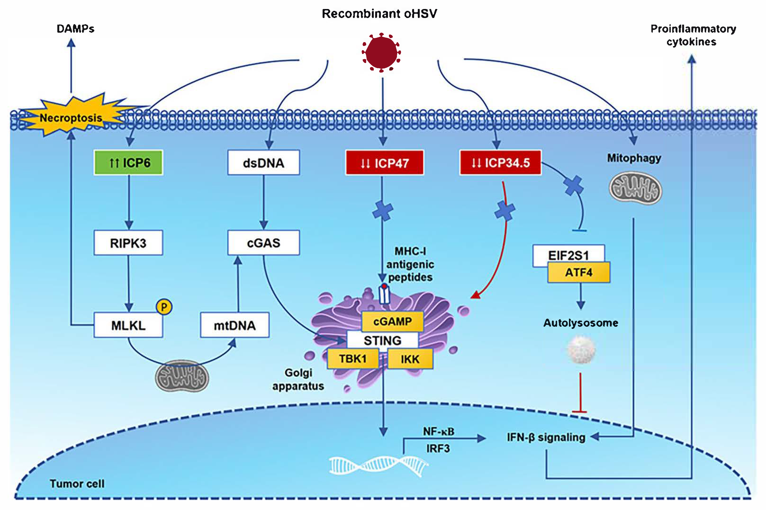 HSV-1 has become a commonly used oncolytic viral vector mainly because of its four advantages: a large genome, allowing it to carry ~30 kb of exogenous genes; efficient replication in various tumor cells with a high expression level of the HSV-1 receptor Nectin1; the lysis of tumor cells; and the intrinsic induction of both innate and adaptive antitumor immunity [75]. We used HSV-1 as an example to explore the molecular processes that regulate antitumor immunity after the virus infection of tumor cells and to explore the safety and design principles of its application from the perspective of molecular mechanisms (Figure 1). The safety of oncolytic viruses needs to consider the dual effects of antiviral and antitumor immunity, which requires the vector to have high immunogenicity to activate immunity and to prevent overstimulated immune inflammation. The cyclic GMP-AMP synthase–stimulator of interferon genes (cGAS-STING) pathway is the core pathway mediating cytoplasmic DNA-triggered immune responses. Virus DNA released in the tumor cell cytoplasm is activated and activates cGAS to recognize and synthesize GTP after HSV infection. Subsequently, cGMP-AMP (cGAMP) binds to STING and recruits TANK-binding kinase 1 (TBK1), promoting the phosphorylation of IRF3. Type I IFN transcription and proinflammatory factor expression are induced by interferon regulatory factor 3 (IRF3) and NF-κB [76]. LRRC8A/SWELL1 is a subunit of the volume-regulated anion channel, which is necessary for the transfer of cGAMP into bystander cells [77]. The γ1 34.5 gene of HSV-1 encodes the ICP34.5 protein, which disrupts STING translocation from the endoplasmic reticulum to the Golgi apparatus and compromises the host’s antiviral immunity [78]. Another selective form of autophagy protects mitochondrial homeostasis, regulates the EIF2S1-ATF4 pathway through HSV-1 protein ICP34.5 to block Parkin-mediated mitophagy, and induces NF-κB-mediated neuroinflammation [79]. Therefore, many oncolytic viruses have been designed to delete the γ1 34.5 gene in order to reduce the weakening of antiviral immunity and the probability of neurotoxicity. ICP47 inhibits the stabilization and translocation of major histocompatibility complex class I (MHC-I) antigenic peptides into the Golgi apparatus, which are necessary in CD8+ cytotoxic T lymphocyte (CTL) immune surveillance [80]. Although ICP47 binds to the peptide binding site of the transporter associated with antigen presentation, removing ICP47 will benefit oncolytic virus therapy [81]. This may be related to the host’s peptide polymorphism [82]. During the process of viral replication, the ICP6 protein participates in the reduction of ribonucleotides to deoxyribonucleotides, providing raw materials for the synthesis of viral DNA, and is a key link in the DNA replication of viruses within host cells. The ICP6 protein can also interact with receptor-interacting kinase-3 (RIPK3). The Rhim domains of the two proteins are necessary conditions for the formation of the ICP6-RIPK3 complex, which directly activates RIPK3/mixed lineage kinase domain-like protein (MLKL)-dependent programmed cell necrosis and triggers antiviral defense [83,84]. MLKL-mediated necroptosis will induce cell membrane rupture and release damage-associated molecular patterns (DAMPs) in the TME. Phosphor-MLKL can also translocate to mitochondria, lead to the microtubule-dependent release of mitochondrial DNA (mtDNA), and activate the cGAS-STING signaling pathway [85].