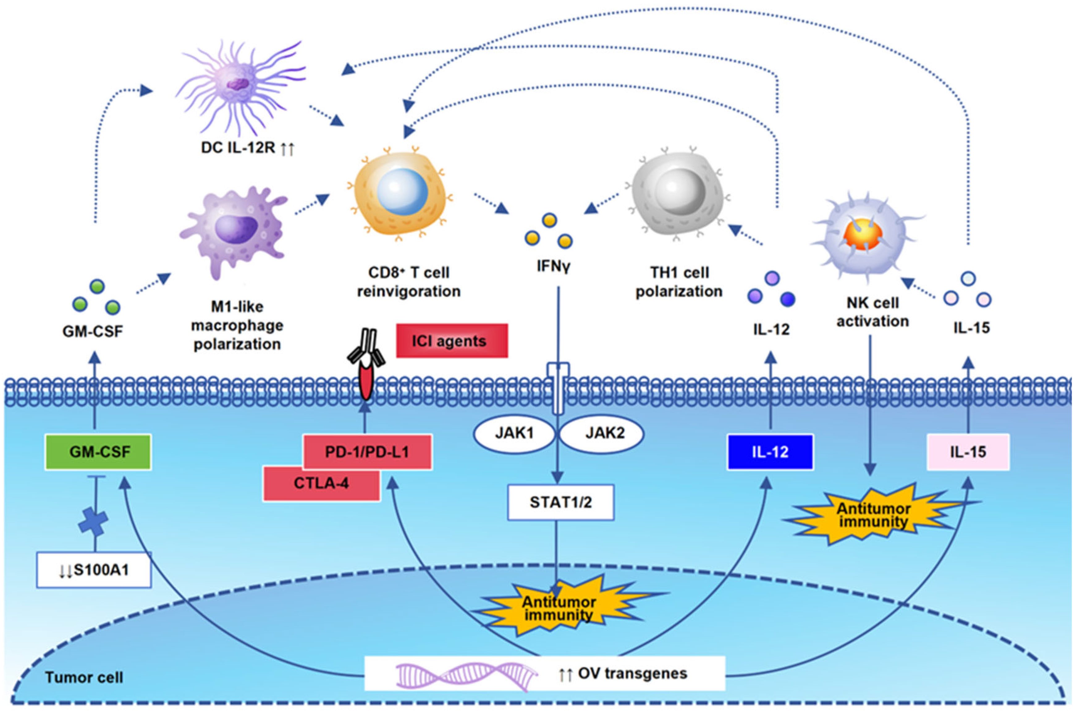 In addition to the modification of the HSV genome itself, the design of transgenes and other immunotherapy combinations also needs to be based on the synergy of antitumor immunity. Prior to 2020, GM-CSF was the most common transgene in OV clinical trials [86]. The statistics of 2022 show that the distribution of the top three transgenes has become IL12R, PD-1, and PD-L1 [87]. This reflects the rapid changes in the OV field to a certain extent. In this review, we summarize and analyze the latest research on the mechanisms of these commonly used oncolytic virus transgenes in antitumor immune regulation so as to provide basic theoretical evidence for oncolytic viruses combined with other immunotherapies (Figure 2). GM-CSF was initially regarded as a hematopoietic growth factor, but now, it is a central mediator of T cells and myeloid cells in immunopathology [88]. The modulation of the GM-CSF axis could potentiate an inflamed TME by promoting M1-like macrophage polarization and CD8+ T-cell reinvigoration. S100 calcium-binding protein A1 (S100A1) is a key upstream regulator of the S100A1/USP7/p65/GM-CSF axis. The blockade of S100A1 will remodel the inflamed and immunoactive TME [89]. Engineered GM-CSF will potentiate the DC response to IL-12 and enhance the expression of proinflammatory cytokines and chemokines. Subsequently, IL-12 exposure will induce TH1 cell polarization and active IFNγ antitumor immunity [90]. IL-12 will generate interferon-γ (IFNγ) production in both innate and adaptive immune cells [91]. Of course, there are many other oncolytic viral designs targeting different antitumor mechanisms. TG6050, an oncolytic vaccinia virus encoding IL12 and the anti-CTLA-4 antibody, can induce an inflamed TME in metastatic non-small cell lung cancer [92]. PARP1 has been identified as a replication restriction factor of HSV-1 after OV injection in mouse models. The combination of PARPi and an immune checkpoint inhibitor can enhance the ability of OV [93]. As shown in another study, a combination of adoptively transferred T cells or mRNA vaccine with OV therapy can significantly increase both cytokine and CD8+ T-cell recruitment [94]. Modulating gut microbiota homeostasis is another supplement combination method used to improve OV therapeutic outcomes via the IL6-JAK-STAT3 signaling pathway [95]. OV has also been used as a replicating vehicle for artificial microRNAs to induce tumor cell killing [96]. There have also been other studies in which chemokine C-C motif ligand 5 (CCL5) and EGFR antibodies have been loaded into oHSV-1, allowing it to recruit immunocompetent cells and inhibit EGFR signaling in the TME of GBM-bearing mice [97]. Researchers have formed a certain consensus that preclinical oncolytic viruses no longer represent a single immune regulatory mechanism but a combination of multiple immune regulatory pathways.