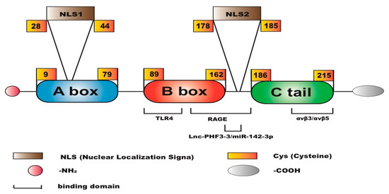 Highly migratory group proteins (HMGB) are a large family of non-histone chromatin proteins that are ubiquitous, abundant, and highly conserved throughout the body. HMGB1 consists of a long molecule of 214 amino acids containing two homologous DNA-binding domains: the A box and the B box. The A box spans amino acids 9 to 79, and the B box spans 88 to 162. The A box and B box domains are responsible for DNA binding and bending, and there is an acidic tail spanning amino acids 186–214, with the acidic carboxyl-terminal region composed of 30 consecutive glutamic acid and aspartic acid residues [9]. The two HMG boxes of HMGB1 are structurally composed of three α-helices and two rings arranged in an “L” shape. HMGB1 has two nuclear localization signals (NLSs) located in the A box (C28-44) and B box (C179-185), respectively. NLS1 contains four conserved lysine residues, and NLS2 contains five [10]. The molecular structure of HMGB1 is shown in Figure 1.