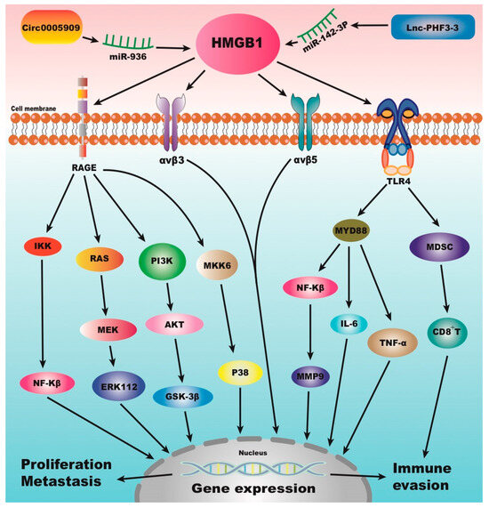 46. Fan, A.; Gao, M.; Tang, X.; Jiao, M.; Wang, C.; Wei, Y.; Gong, Q.; Zhong, J. HMGB1/RAGE axis in tumor development: Unraveling its significance. Front. Oncol. 2024, 14, 1336191. [Google Scholar] [CrossRef]
