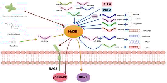 The different therapeutic approaches targeting the expression of HMGB1 and its downstream signaling pathways are summarized in Table 2 and Figure 3.