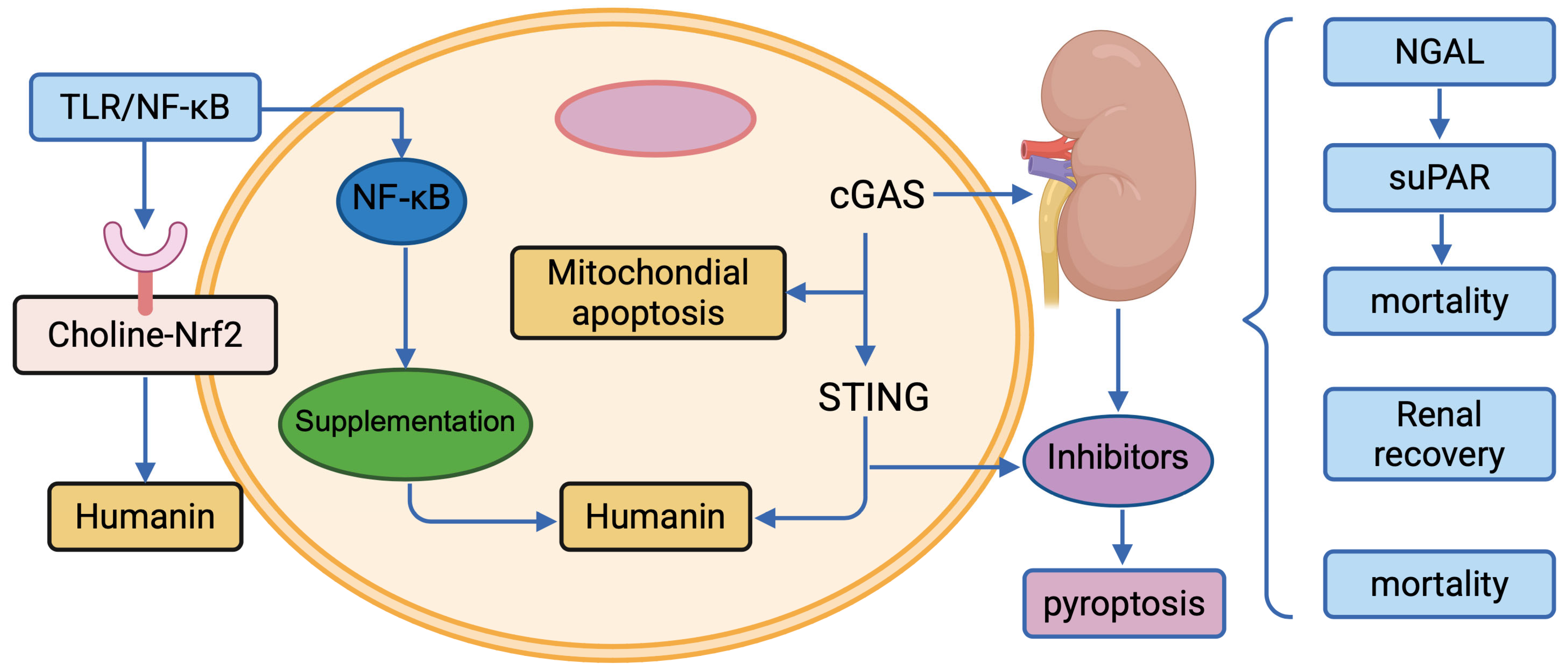 Despite advances, significant research gaps persist. Pediatric-specific data remain limited compared to adults, with most mechanistic insights derived from animal models or adult cohorts, potentially overlooking age-dependent renal maturation and immune responses [30]. Diagnostic heterogeneity across criteria (e.g., pRIFLE vs. KDIGO) complicates incidence comparisons, and translational barriers hinder the application of novel therapeutics like cGAS-STING inhibitors in children [31,32]. Moreover, integrating multi-omics approaches (e.g., metabolomics for choline pathways) with clinical biomarkers is underdeveloped, impeding precision medicine [33].