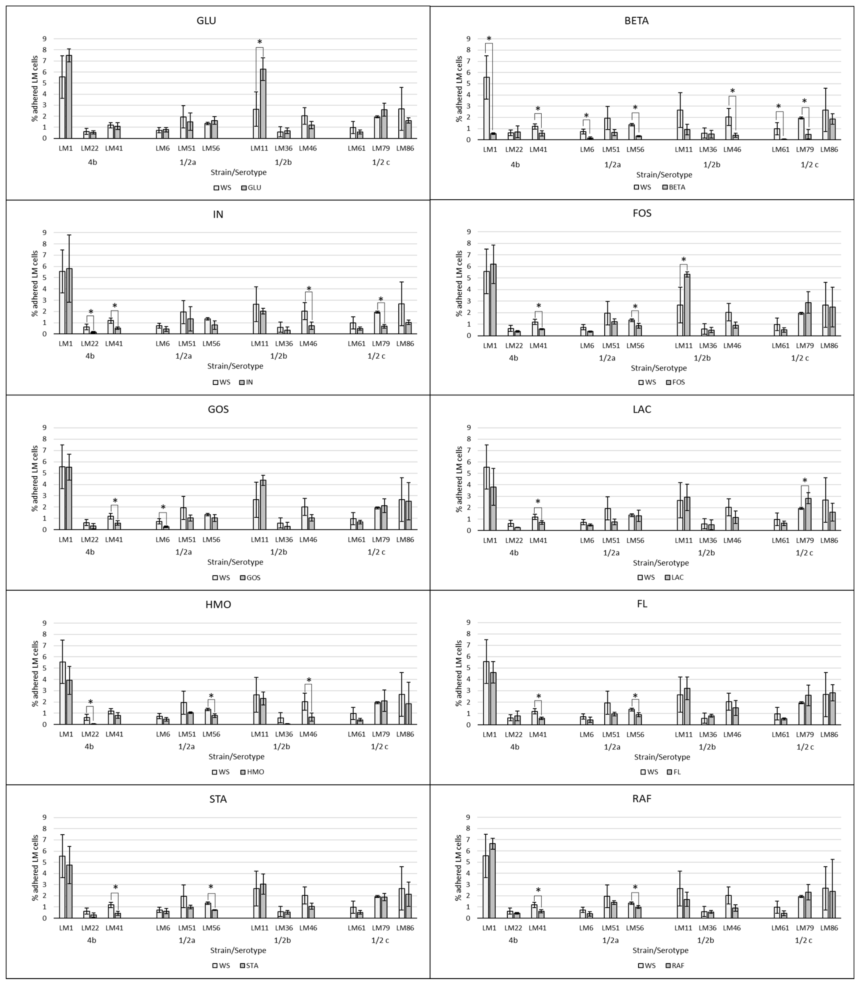 Figure 2. Effect of prebiotics at concentration of 10 g/L on the adherence of individual LM strains compared to the control groups without saccharide supplementation. The data are the means of three independent experiments, expressed as a percentage of the adhered LM compared to the total bacteria added. The error bars represent the standard deviations. WS: without saccharides, GLU: glucose, BETA: beta-(1-3)-D-glucan, IN: inulin, FOS: fructooligosaccharides, GOS: galactooligosaccharides, LAC: lactulose, HMO: mixture of human milk oligosaccharides, FL: 2’-fucosylactose, STA: stachyose, RAF: raffinose, LM: Listeria monocytogenes, *: data significantly differ (p < 0.05).