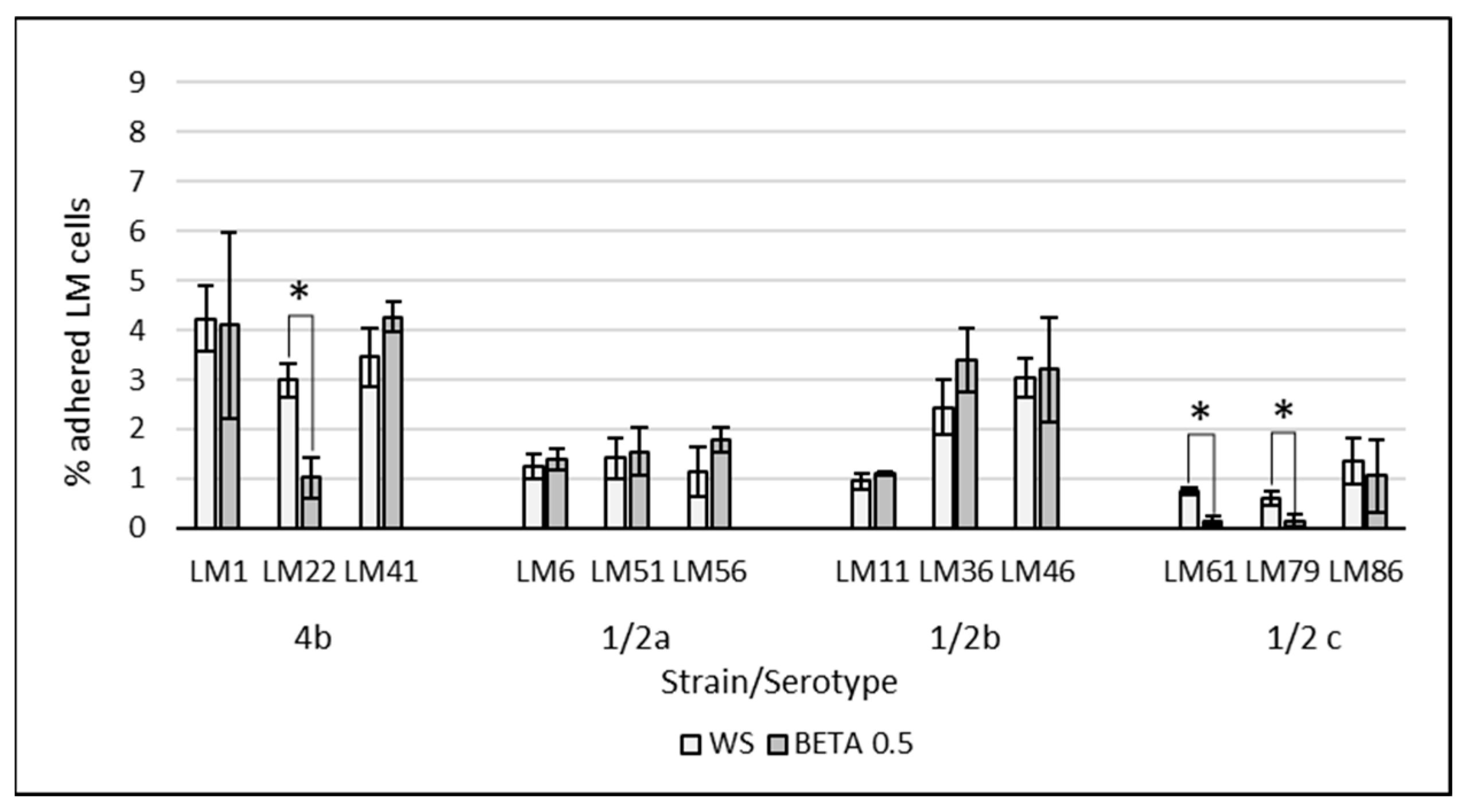 Figure 3. Effect of beta-(1-3)-D-glucan at concentration of 0.5 g/L on the adherence of individual LM strains compared to the control groups without saccharide supplementation. The data are the means of three independent experiments, expressed as a percentage of the adhered LM compared to the total bacteria added. The error bars represent the standard deviations. WS: without saccharides, BETA 0.5: beta-(1-3)-D-glucan at concentration of 0.5 g/L, LM: Listeria monocytogenes, *: data significantly differ (p < 0.05).