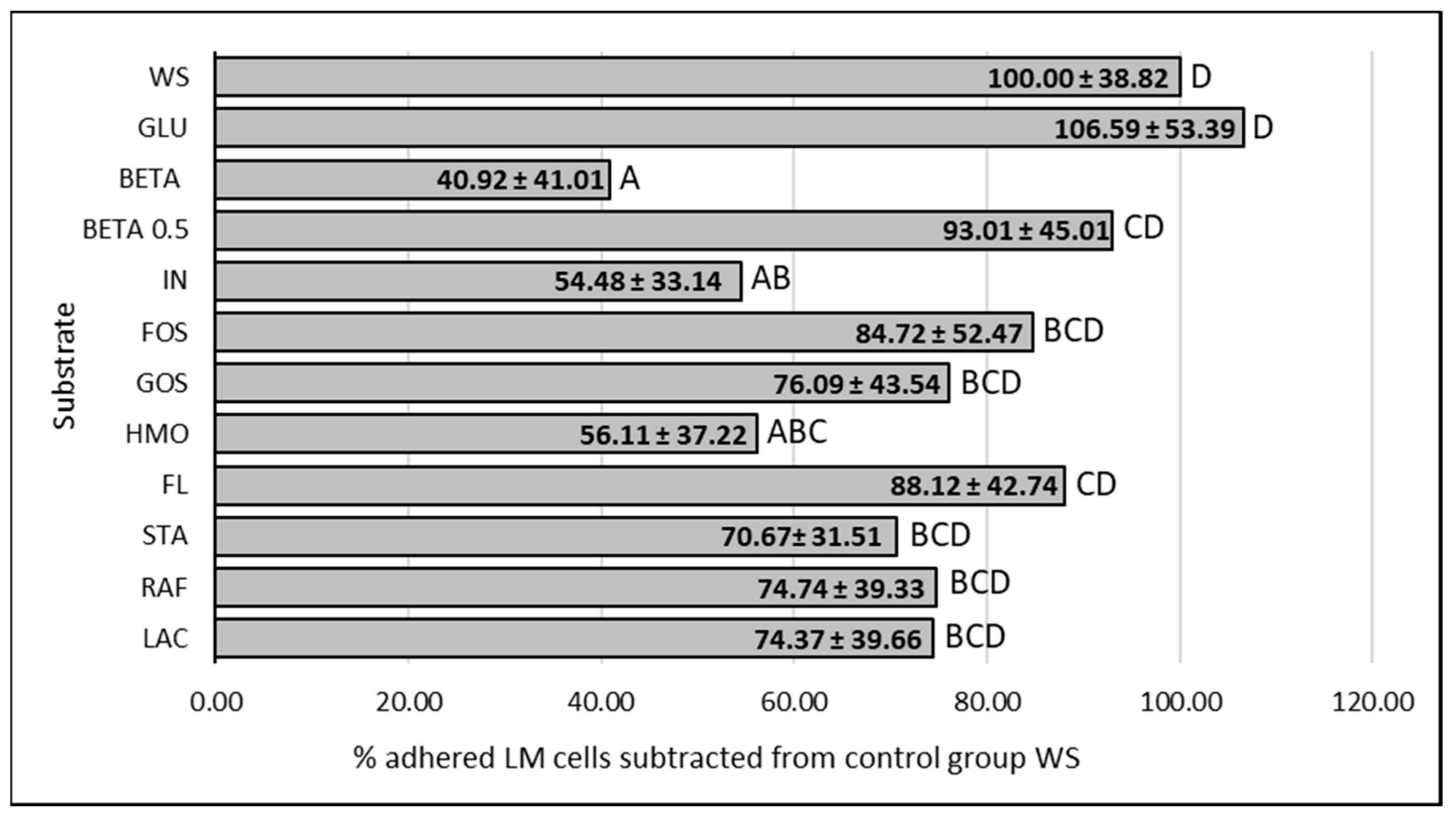 Colonic cell adhesion assay was performed according to previously described methods [27,33,43] with some modifications. Caco-2 cells were seeded in a 96-well culture plate (VWR, CZ) at a density of 2 × 105 cells per well and grown for 14 ± 1 days until confluent at 37 °C in a humidified atmosphere of 5% CO2 and 95% air (v/v). The culture medium was changed every 2 days. Before adding the substrate-supplemented medium and bacterial inoculum, the cell monolayers were washed with PBS to remove antibiotics. Thereafter, the Caco-2 cells were pre-incubated in 37 °C with 90 μL prepared testing media solutions for 20 min. LM inoculums were prepared from fresh overnight cultures grown under aerobic conditions at 37 °C in brain–heart infusion broth (Oxoid, UK), which was checked for purity with a phase-contrast microscope (Nikon Eclipse E200LED MV RS, Nikon, Tokyo, Japan). Bacterial cultures were than centrifuged for 2 min at a speed of 14,500 rpm, washed twice with phosphate-buffered saline (PBS) buffer (VWR, France), and diluted to 5 × 108 cells per 1 mL of the media. These bacterial suspensions were inoculated into each sample to obtain a final density of 5 × 107 CFU/mL [48]. The prepared samples were incubated for 2 h at 37 °C in an atmosphere of 5% [49,50]. All experiments were tested in triplicate. After incubation, the cell layers were washed three times with PBS to remove non-adherent bacteria and finally lysed by the addition of 50 μL of 1% Triton X-100 (Sigma-Aldrich, Prague, Czech Republic) for 30 s. To terminate the lysis process, 150 μL of PBS buffer was added. Bacterial growth was evaluated by the agar plate count technique. Samples were serially ten-fold diluted to a concentration of 10−7 and spread on the surface of BHI agar plates. After the incubation at 37 °C for 24 h, colonies were counted and the numbers expressed as colony-forming units (CFU) per 1 mL of the samples. Each of the tested group combinations of LM strains and substrates was analyzed in triplicate. Adhesion data for individual LM strains and substrates were expressed as the percentage of bacteria adhered compared to the total of bacteria added (Musilova et al., 2017 [43]). A general assessment of the impact of individual prebiotics on adherence was evaluated as a percentage of bacteria adhered in the presence of prebiotic compared to the control WS, where the control represents 100% adhesion [30]. Finally, the data was also expressed as logCFU/mL (Table A1).