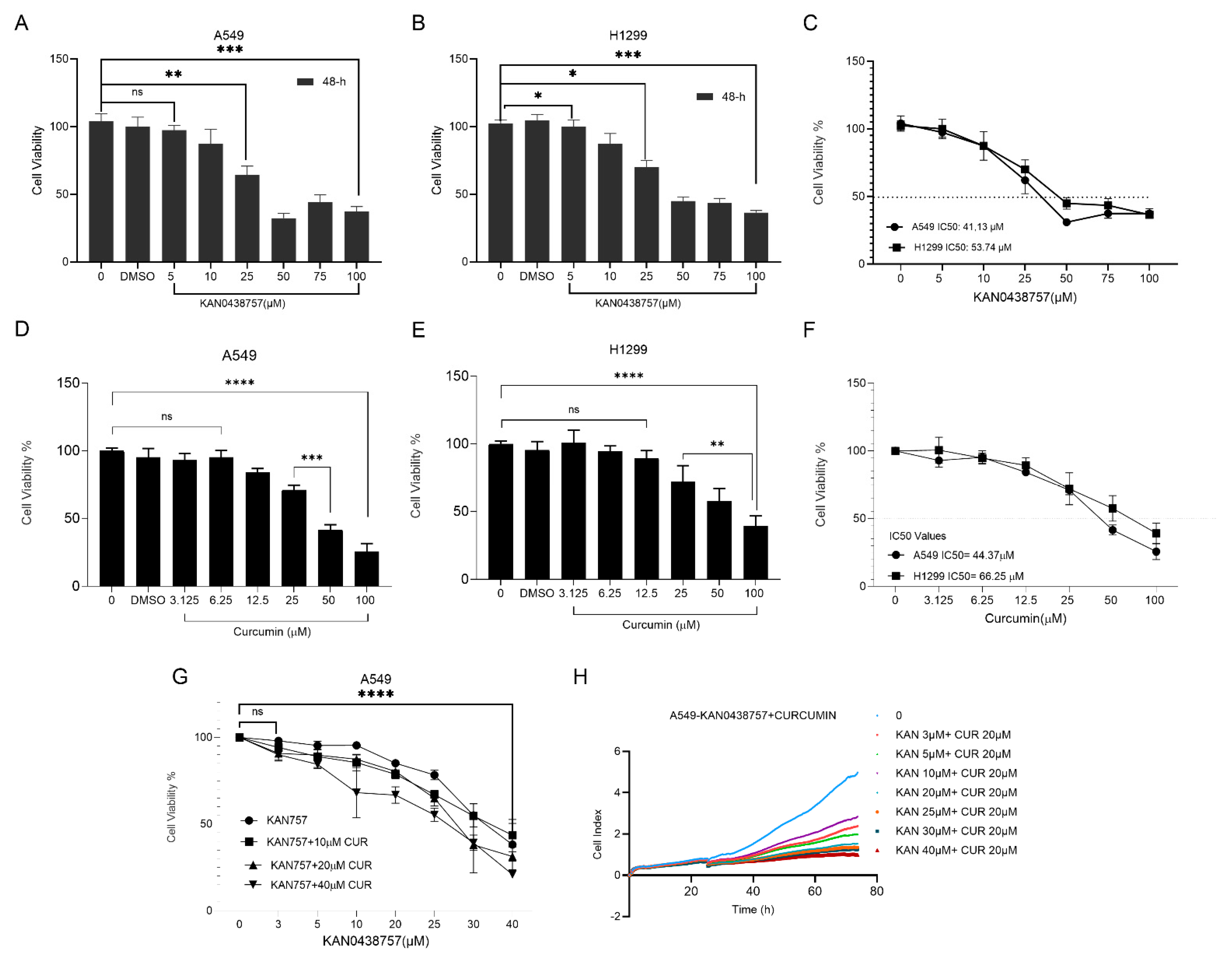 3.1. Antiproliferative Effects of KAN438757, Curcumin, and Their Combination in A549 and H1299 Cells