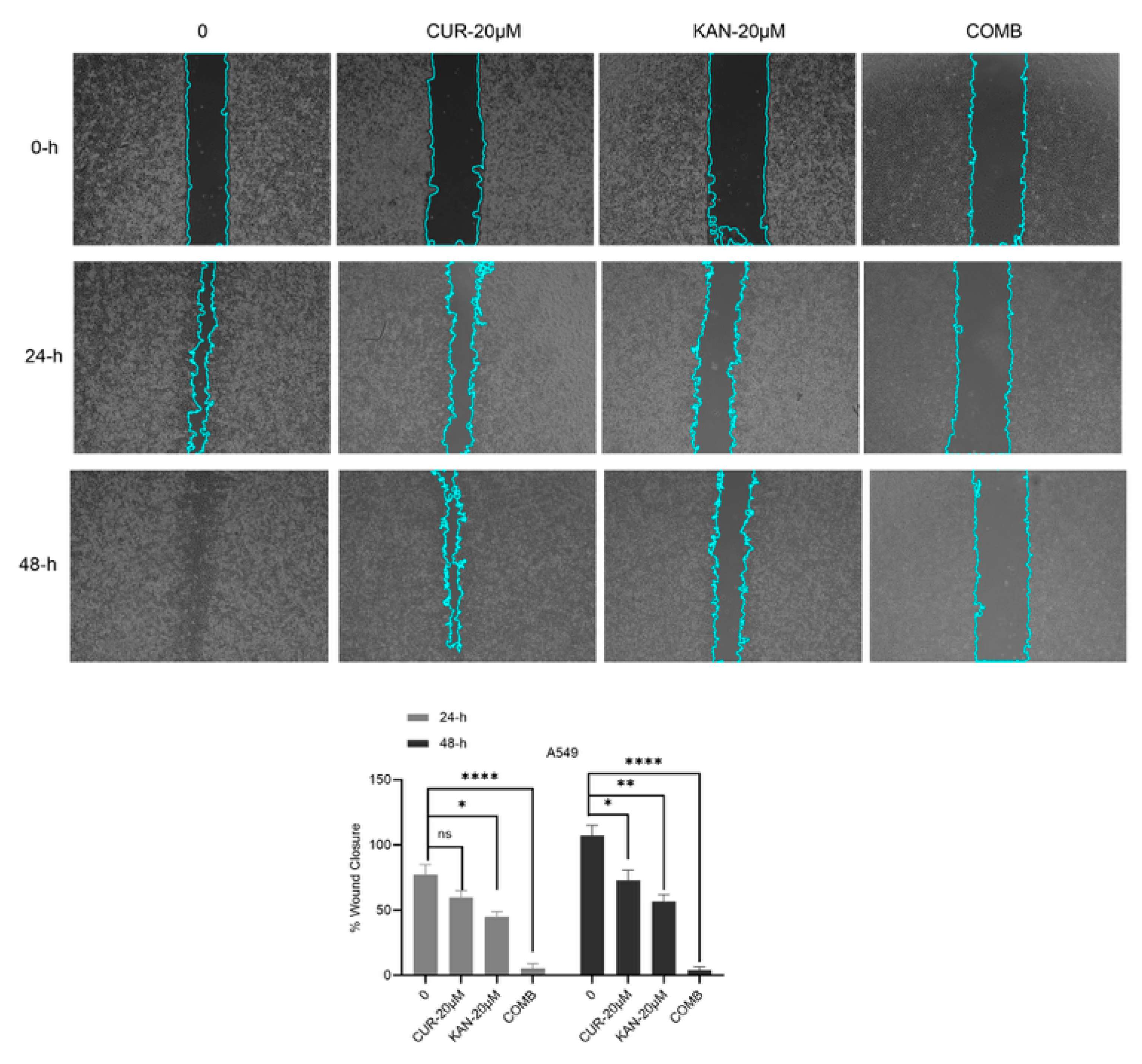 3.2. Cell Migration Findings of KAN438757 and Curcumin Combinations in A549 Cell Line