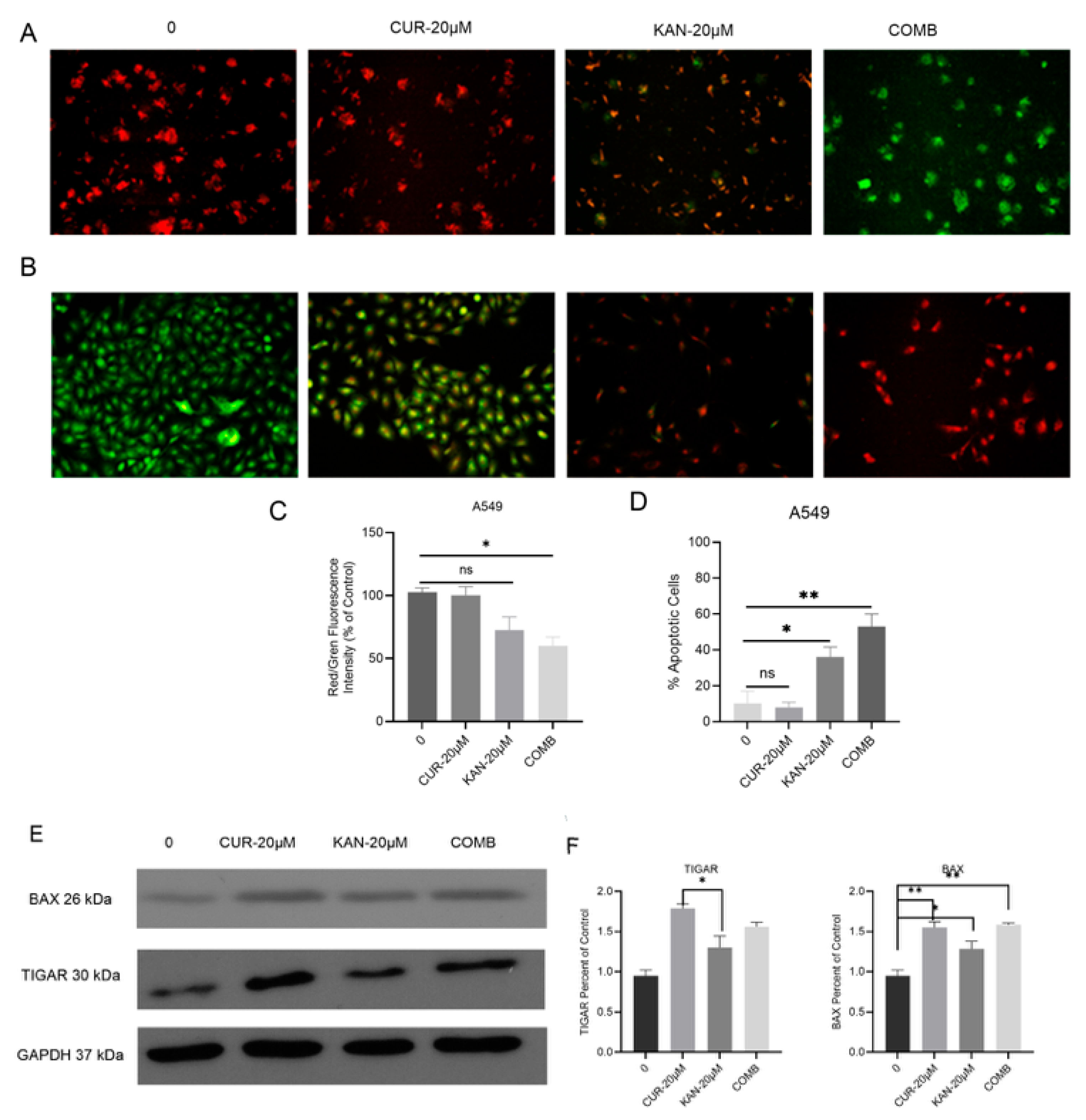 3.4. Mitochondrial Membrane Potential and Cell Death in A549 Cells Treated with KAN438757–Curcumin Combination