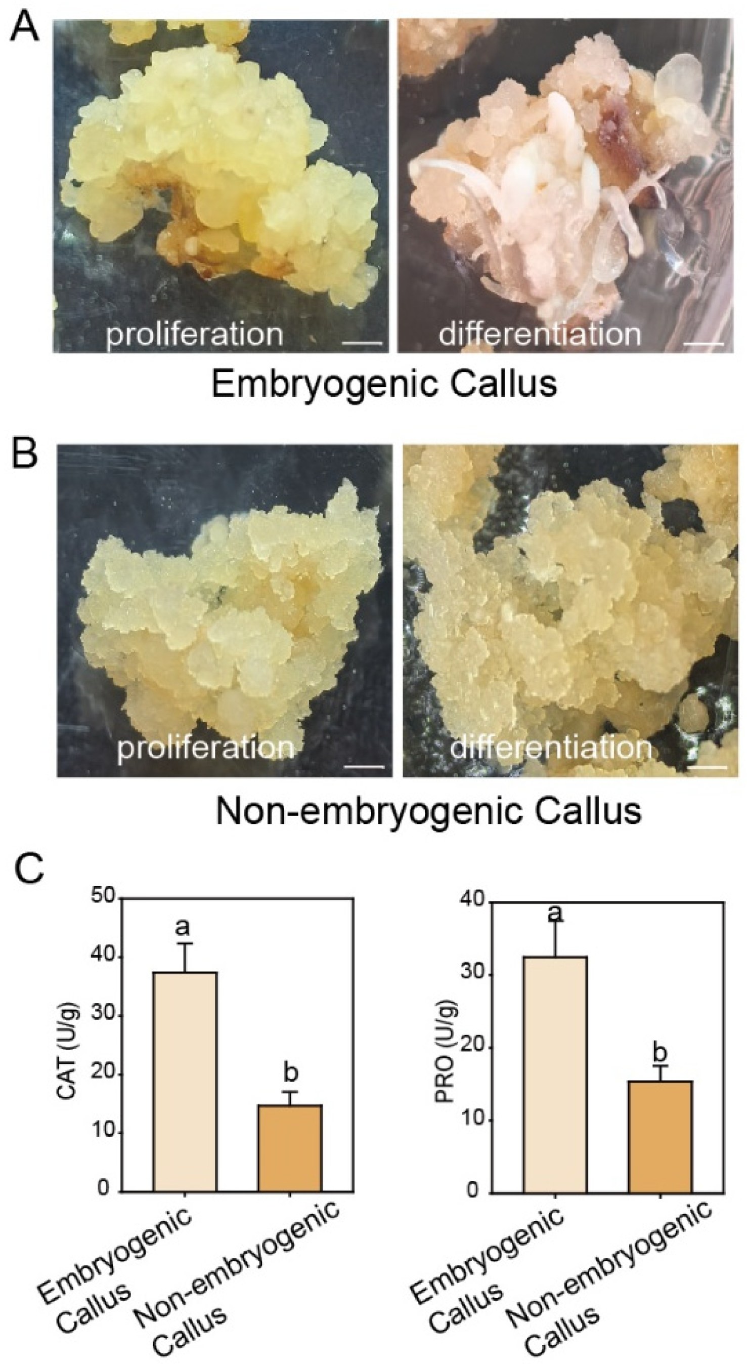 3.1. Comparison of Embryogenic and Non-Embryogenic Callus