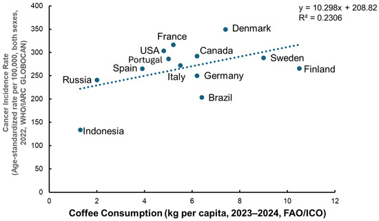 Relationship between coffee consumption and age-standardized total cancer incidence. A correlation analysis was conducted using country-level data on coffee consumption (kg per capita, 2023–2024) from the FAO/International Coffee Organization (ICO) and age-standardized total cancer incidence (per 100,000 population, both sexes, excluding non-melanoma skin cancer, 2022) from WHO/IARC GLOBOCAN. The analysis revealed a weak positive association between per capita coffee consumption and total cancer incidence (R2 = 0.23), indicating that coffee intake alone does not explain global variations in cancer occurrence. Data sources: FAO/European Coffee Report 2023–2024 (https://www.ecf-coffee.org/european-coffee-report-2023-2024/, accessed on 22 October 2025); WHO/IARC GLOBOCAN 2022 (https://www.wcrf.org/preventing-cancer/cancer-statistics/global-cancer-data-by-country/#global-cancer-incidence-both-sexes, accessed on 22 October 2025).
