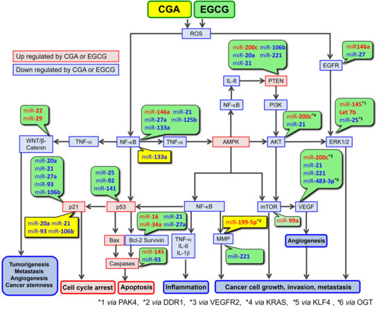 CGA and EGCG share similar properties in that they can scavenge ROS, which triggers the anticancer pathway leading to cell cycle arrest, apoptosis, and the prevention of inflammation and metastasis. These polyphenols can modulate the expression/activity of multiple components of this pathway by increasing the expression of tumor-suppressing miRs and decreasing the expression of oncogenic miRs in general. Therefore, the effects of these miRs may additively or synergistically enhance the anticancer effects of CGA and EGCG.
