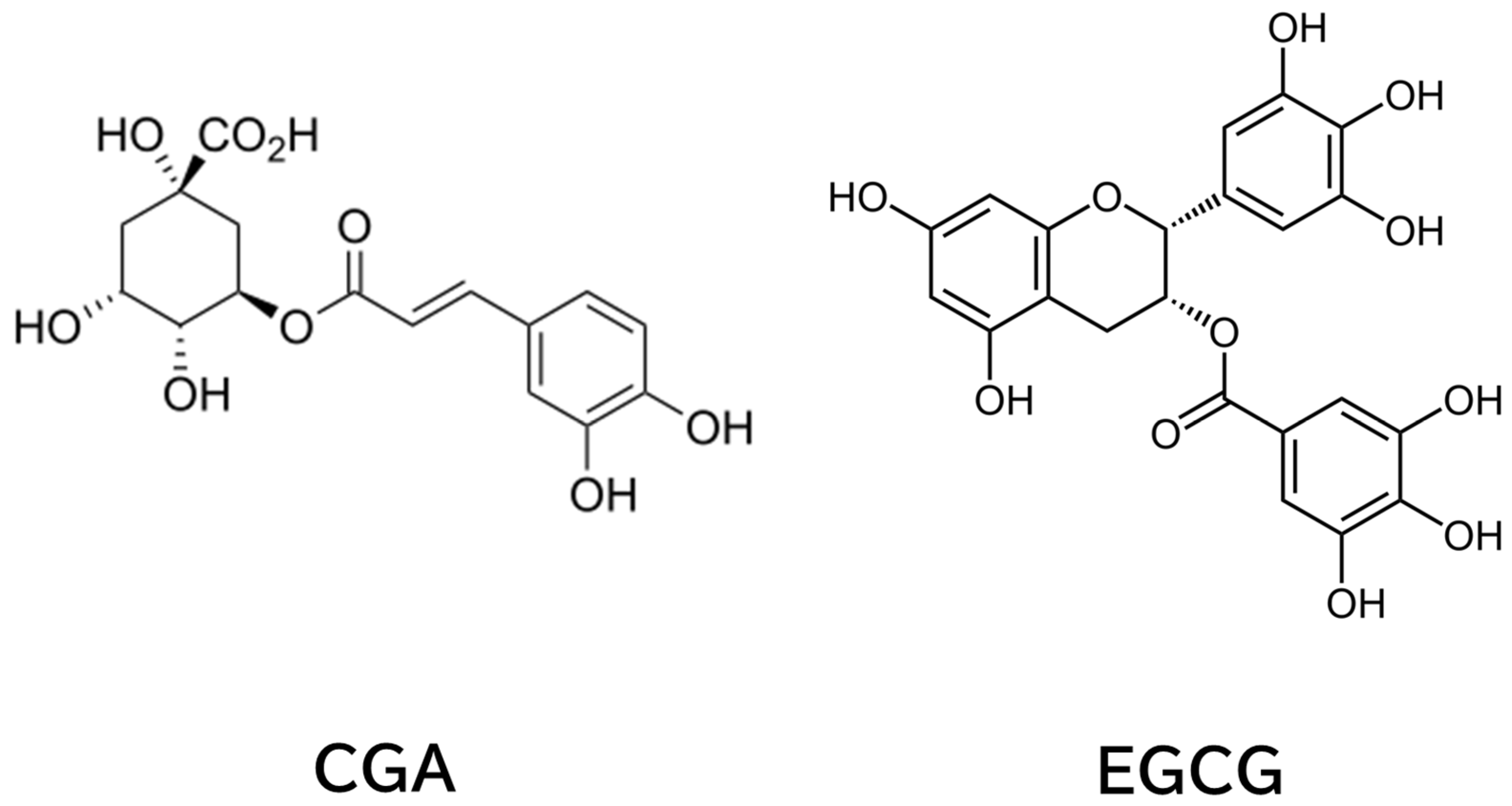 - Hayakawa, S.; Ohishi, T.; Miyoshi, N.; Oishi, Y.; Nakamura, Y.; Isemura, M. Anti-Cancer Effects of Green Tea Epigallocatchin-3-Gallate and Coffee Chlorogenic Acid. Molecules 2020, 25, 4553. [Google Scholar] [CrossRef]