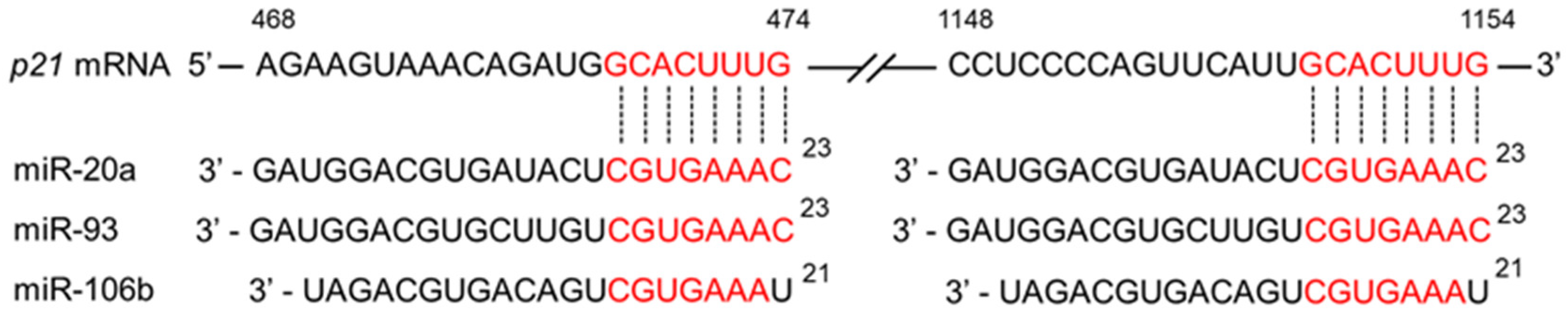 | miR-106b | 25 μM CGA Huang et al. [128] 50 μM EGCG Chakrabarti et al. [148] | p21 Huang et al. [128] PTEN Dhar et al. [187] | ↓ Huang et al. [128] ↓ Dhar et al. [187] |