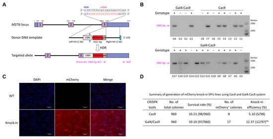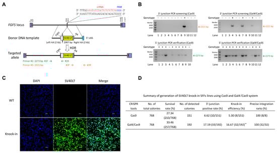 3.5. CRISPR/Cas9-Gal4 System Promote the Generation of Exogenous Large DNA Fragment Targeted Integration SFFs Lines