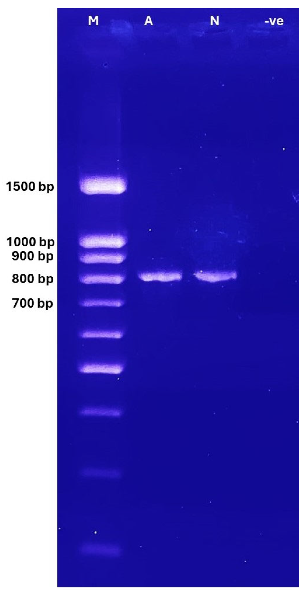 In this study, agarose gel electrophoresis was used to detect the PCR fragments of the MT-CO2 gene (820 bp) on 2% agarose gel (Figure 1).