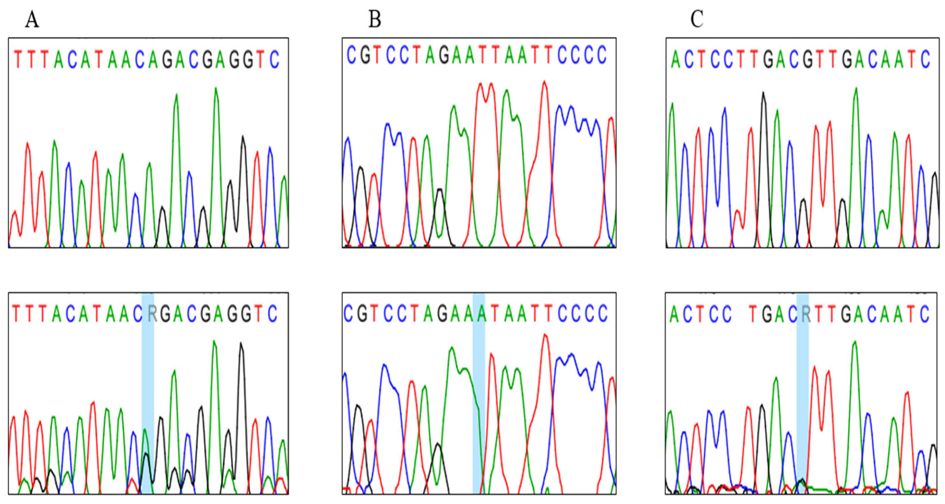 Figure 2. Sequence chromatograms of novel variants recorded in the MT-CO2 gene, (A) m.7997 heteroplasmy variant (allele G>A), (B) m.8222 homoplasmy variants (allele T> A), and (C) m.7997 G>A heteroplasmy variant (allele G>A).