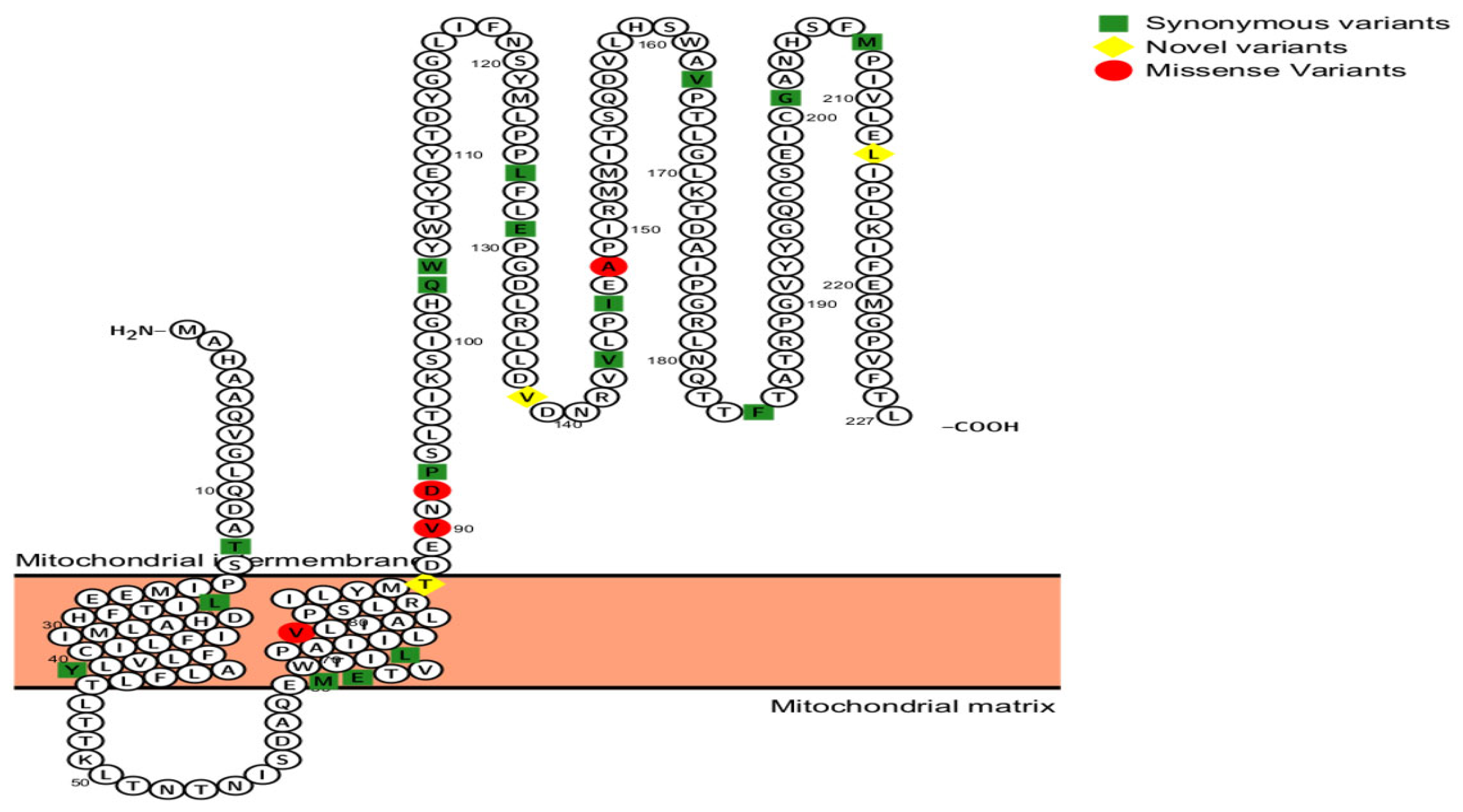 To assess the potential impact of sequence variations on the hydrophobicity and transmembrane domain of Cytochrome c oxidase subunit 2 (MTCO2) protein were employed by used the online tool PolyPhen-2 (http://genetics.bwh.harvard.edu/pph2/) and Protter https://wlab.ethz.ch/protter/start/ (accessed on 3 August 2025) as shown in Figure 3.