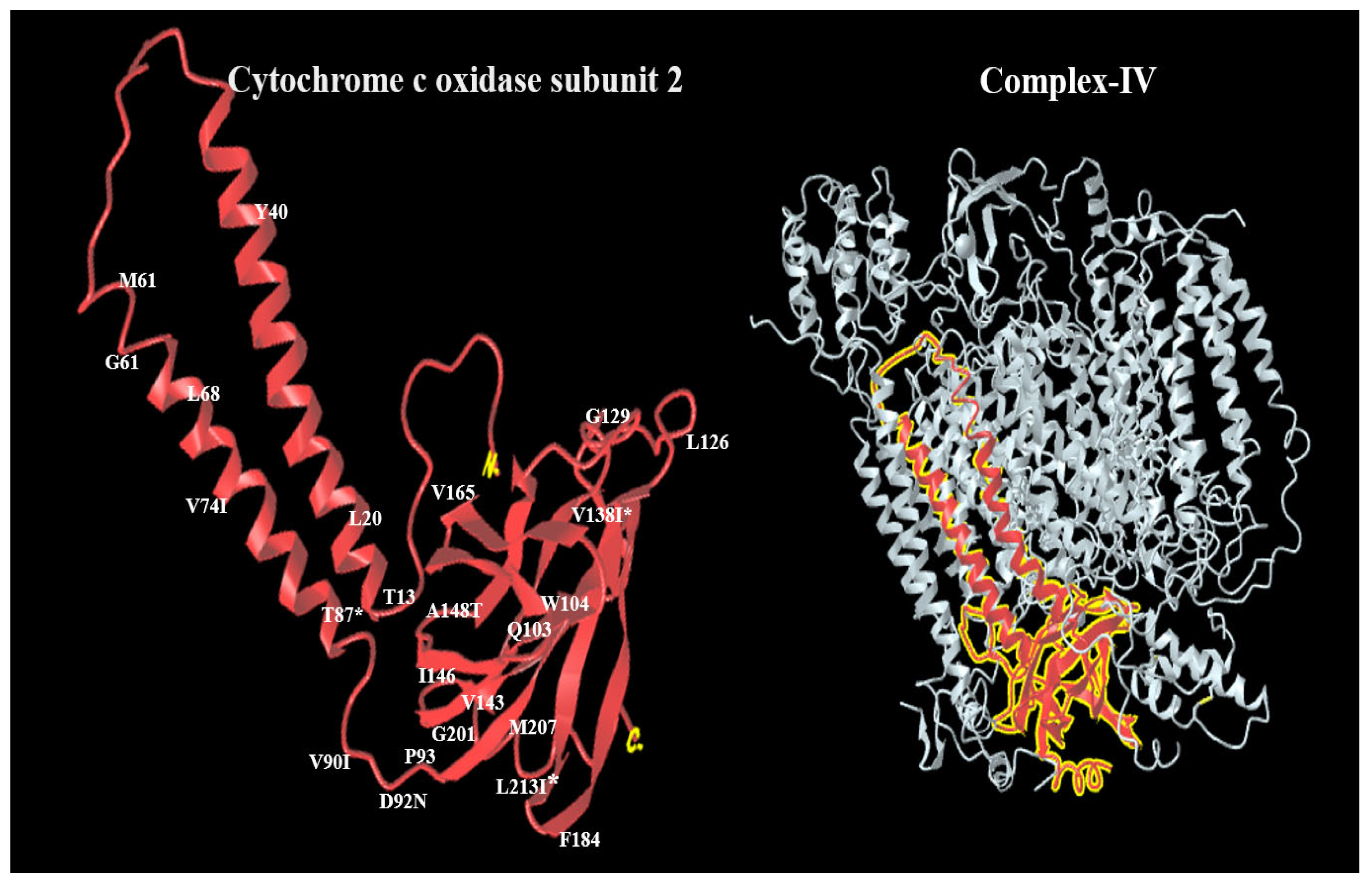 Figure 4. Three-dimensional structure of Cytochrome c oxidase subunit 2, which is part of Complex IV in the mitochondrial electron transport chain, labeled with recorded variants at different positions, * novel variant.