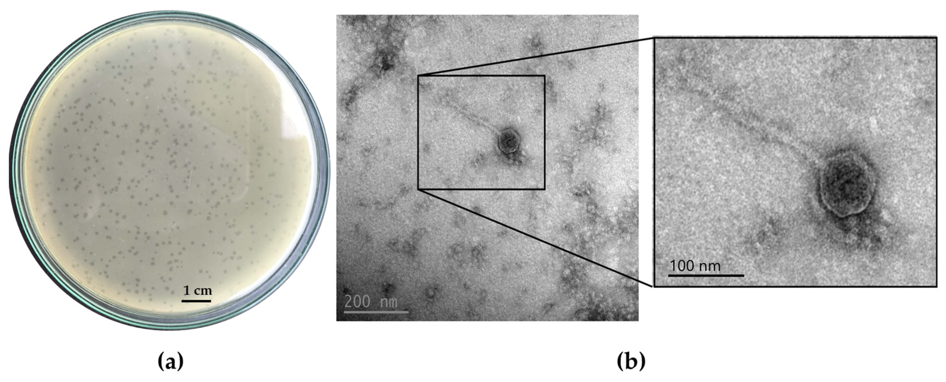 - Artawinata, P.C.; Lorraine, S.; Waturangi, D.E. Isolation and characterization of bacteriophages from soil against food spoilage and foodborne pathogenic bacteria. Sci. Rep. 2023, 13, 9282. [Google Scholar] [CrossRef]
