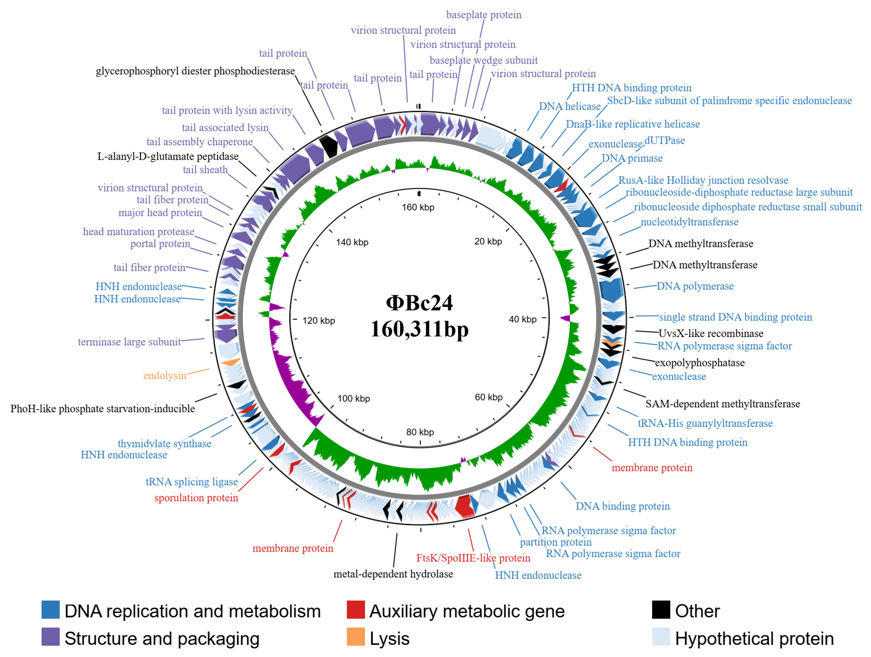 3.8. Characterization of Phage ΦBc24 Genome