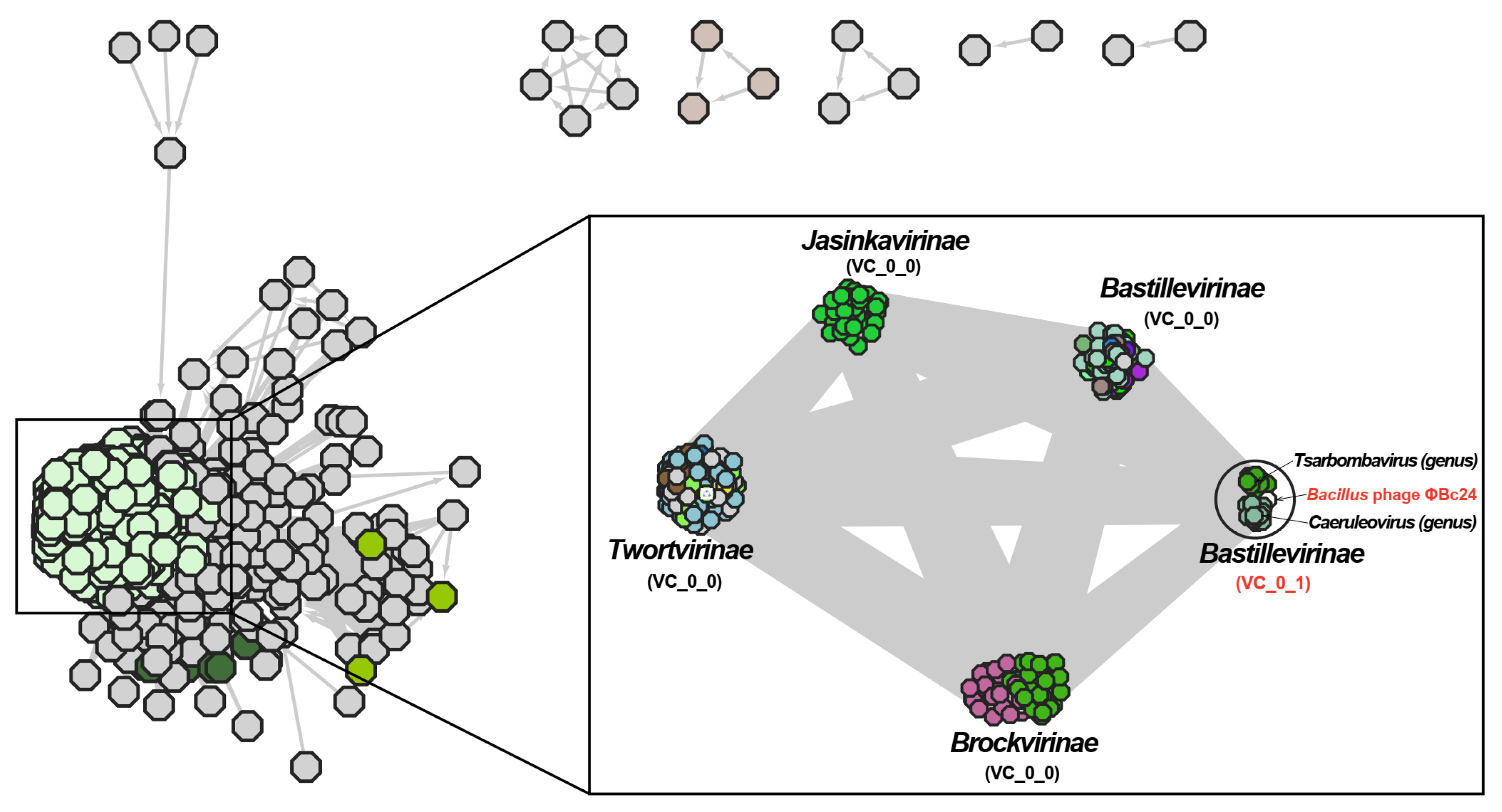 - Bin Jang, H.; Bolduc, B.; Zablocki, O.; Kuhn, J.H.; Roux, S.; Adriaenssens, E.M.; Brister, J.R.; Kropinski, A.M.; Krupovic, M.; Lavigne, R. Taxonomic assignment of uncultivated prokaryotic virus genomes is enabled by gene-sharing networks. Nat. Biotechnol. 2019, 37, 632–639. [Google Scholar] [CrossRef]