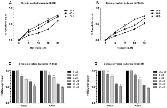Reversine induces a time- and dose-dependent apoptotic response in Chronic Myeloid Leukemia (CML) cell lines and modulates aurora kinase gene expression. (A) K-562 and (B) MEG-01 cells were treated with increasing concentrations of reversine (5, 10, 20, and 30 µM) for 24 h (●), 48 h (∎), and 72 h (▲). Apoptotic activity was assessed using the Caspase-Glo® 3/7 Assay System (Promega), and luminescence values were normalized to DMSO control (<0.1%). Data are presented as mean ± SD from three independent experiments performed in triplicate. Statistical analysis was performed using one-way ANOVA followed by Bonferroni post hoc test. (C,D) qPCR analysis of AURKA and AURKB mRNA expression in both cell lines treated with reversine (0, 5, 10, 20, and 30 µM) for 24 h relative to DMSO, which served as the calibrator sample. Data are shown as mean ± SD of three independent experiments. Where differences did not reach statistical significance, results are discussed as observed tendencies rather than significant effects.