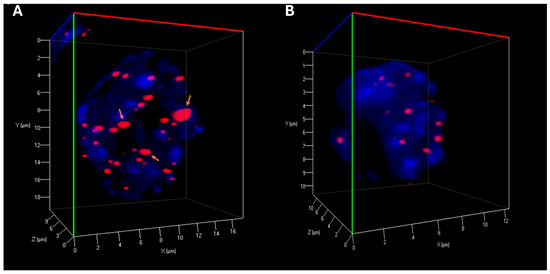 Three-dimensional (3D) telomere analysis, performed using TeloView® software, enables quantitative assessment of the 3D telomere architecture by evaluating parameters such as telomere number, length, signal intensity, spatial distribution, and the presence of telomere aggregates [16,17]. In CML, abnormalities in telomere dynamics have been correlated with disease progression, with increased telomere aggregates and nuclear volume alterations being observed in advanced phases of the disease [18]. Studies have shown that as CML progresses from the chronic phase to the blast crisis, there is a shift in telomere organization, which may be linked to genomic instability and resistance to therapy [19].