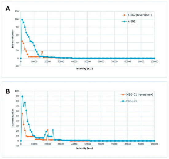 The data presented in Figure 3A,B illustrated the distribution of telomere intensity, a parameter correlating with telomere length, in CML cells under distinct experimental conditions. The analysis included two CML cell lines, K-562 and MEG-01, each assessed in both untreated and reversine-treated states.