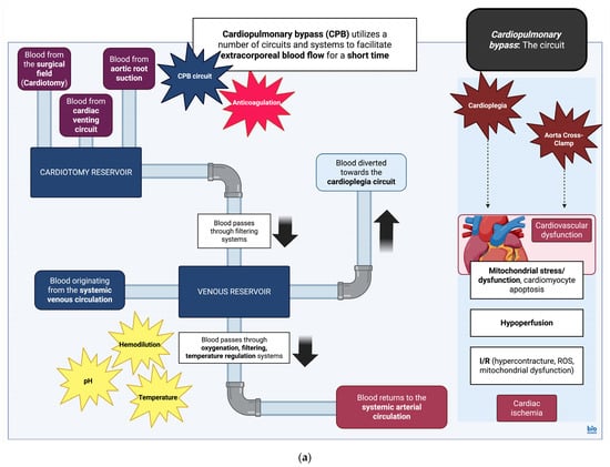 Cardioplegia can be generally described as a technique used to induce cardiac arrest in the operated myocardium. A blood-free surgical field is additionally generated via cross-clamping of the aorta for a specified amount of time during CPB []. Aorta cross-clamping is associated with ischemic injury to the myocardium; this usually leads to the accumulation of by-products such as lactate, causing metabolic acidosis [,]. At the same time, calcium (Ca2+) handling is impaired, affecting cardiomyocyte contraction, while the activation of signaling pathways causing caspase-3 activation will stimulate cardiomyocyte apoptosis pathways as well []. The reintroduction of perfusion after cross-clamp removal will further accentuate tissue insult and lead to the production/accumulation of ROS, intracellular Ca2+ increase, stimulation of inflammatory signaling pathways involving both neutrophil and macrophage responses, and finally, stimulation of cardiomyocyte cell death pathways []. Aorta cross-clamp can also affect the biomechanical properties of the aortic wall itself, though no histological changes have been observed in associated studies []. However, some studies do show an association of aorta cross-clamping with pressure-induced aortic injury and late aortic sequelae, such as aortic rupture []. In essence, cardioplegic arrest and aorta cross-clamping recapitulate ischemia/reperfusion (I/R) tissue injury.