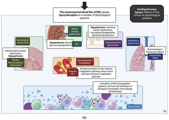 Finally, CPB can have detrimental effects on a number of systems, including effects on coagulation due to contact activation and the release of tissue factor from the surgical field of operation []. Neurological sequelae can be mainly attributed to I/R injury as well as hypoperfusion and hypoxia []. Hypoperfusion, along with pre-existing conditions such as T2DM or poor glucose regulation, can also contribute to acute kidney injury (AKI) []. Reactions to substances employed for heparin reversal (protamine) or blood products may lead to bronchospasm [], whilst excessive fluid transfusion can cause transfusion-related acute lung injury (TRALI) and non-cardiogenic pulmonary edema []. Finally, the general hypoperfusion associated with the operation can also lead to the hypoperfusion of abdominal viscera and gastrointestinal injury. This eventually results in injury/cell death of the intestinal epithelium, dysregulation in intestinal microbiota, and, as a result, bacterial translocation across the intestinal barrier causing multiple organ dysfunction [] (Figure 1).