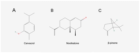 Chemical structure diagrams of the three components. (A) Chemical structure diagrams of Carvacrol. (B) Chemical structure diagrams of Nootkatone. (C) Chemical structure diagrams of β-pinene.