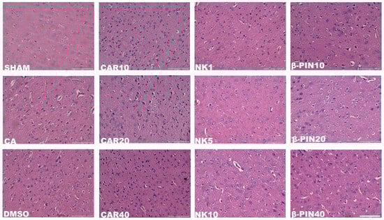 As shown in Figure 2, H&E staining of the rat peri-infarct cerebral cortex at 200× magnification revealed a clear and intact peri-infarct cortical structure in the SHAM group. In contrast, the model groups (MCAO and CA/CPR) exhibited disorganized brain tissue in the peri-infarct cerebral cortex, with irregular neuronal cell bodies, vacuolization, and nuclear condensation. These observations confirmed the successful modeling of CIRI. In the treated groups (CAR 10 mg/kg, NK 5 mg/kg, β-PIN 10 mg/kg), these morphological changes in the peri-infarct cerebral cortex were partially alleviated, with the NK 5 mg/kg group showing the most significant improvement. Similar results were obtained in the MCAO model (Figure 3). Therefore, CAR 10 mg/kg, NK 5 mg/kg, and β-PIN 10 mg/kg treatment groups were selected for subsequent experiments.