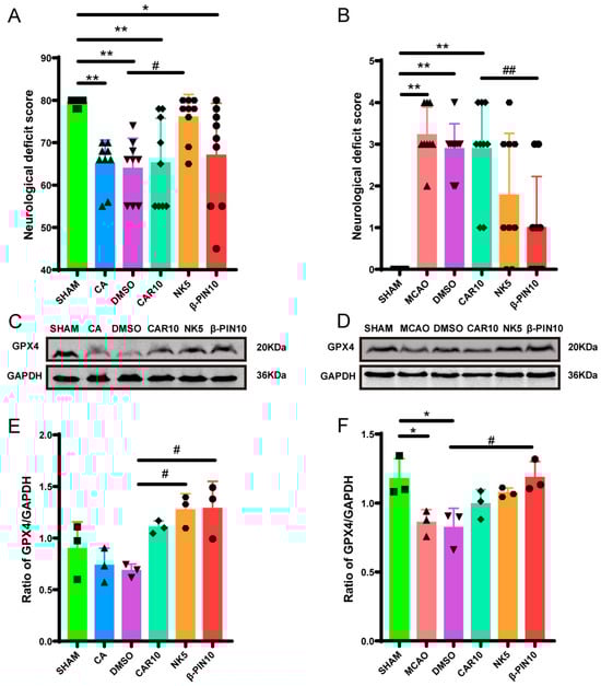 Additionally, the expression of the key ferroptosis protein GPX4 was measured in the brain tissues of the rats 24 h after the surgery. In the MCAO model, GPX4 levels were reduced in both the MCAO and DMSO groups compared to the SHAM group. However, GPX4 levels were significantly elevated in the NK 5 mg/kg and β-PIN 10 mg/kg groups compared to the DMSO group (Figure 4C–F).