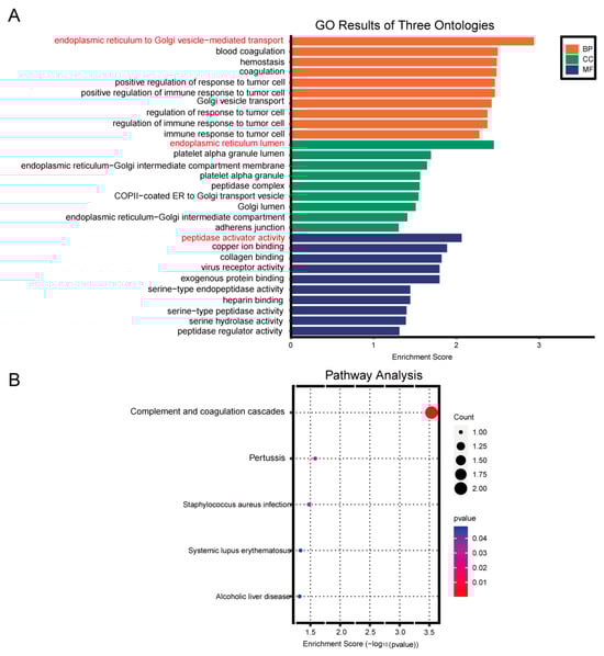 Additionally, GO analysis revealed that the biological processes associated with the differentially expressed genes primarily involved the endoplasmic reticulum to Golgi vesicle-mediated transport. The cellular components were predominantly located in the endoplasmic reticulum lumen, while the molecular functions were primarily related to peptidase activity (Figure 7A). KEGG pathway enrichment analysis identified complement and coagulation cascades as the main pathways (Figure 7B).