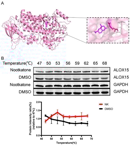 CETSA is a technique used to detect the binding efficiency of drugs to target proteins, based on the principle of protein thermal stability []. When a drug binds to its target protein, the protein’s structure becomes more stable, making it less prone to denaturation at higher temperatures. Compared to proteins that do not bind to the drug, the drug-bound protein degrades less at the same temperature. In comparison to the DMSO group, the Nootkatone group exhibited higher thermal stability of ALOX15, indicating that Nootkatone binds to ALOX15, which further supports the molecular docking results (Figure 9B).
