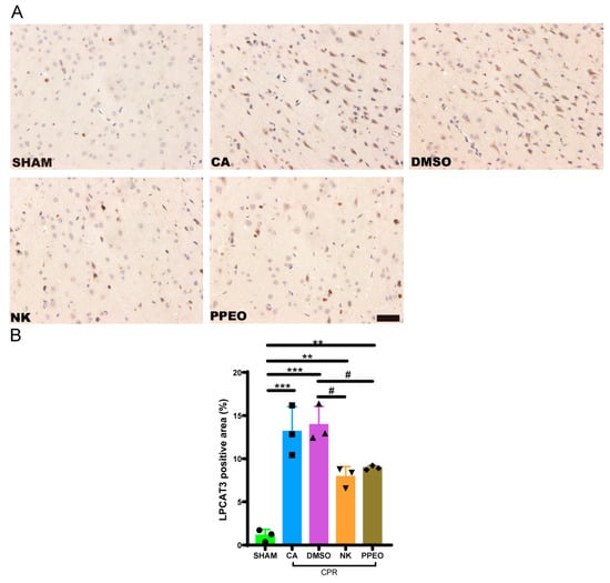 Immunohistochemistry staining (A) Immunohistochemistry staining for LPCAT3 in cortex neurons (200× scale is 50 μm) (B) Statistical analysis bar graph in each group, respectively (F (4, 10) = 26.40, n = 3) (# p < 0.05, ** p < 0.01, *** p < 0.001).The black squares, circles, and triangles represent independent biological replicate samples within each group.