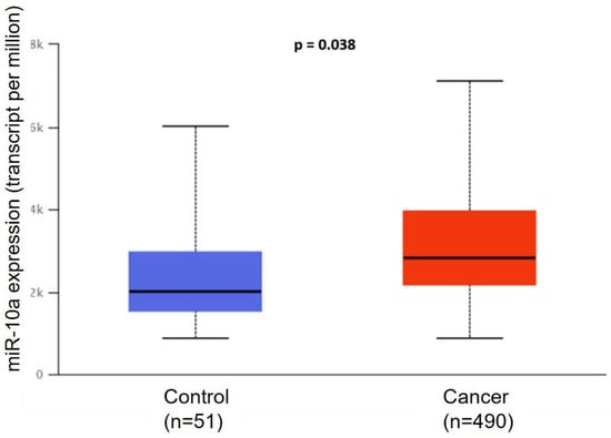 Bioinformatics analysis in the TCGA program showed that miR-10a is overexpressed in the cancer group (n= 490) compared to the control (n = 51) (p = 0.038) (Figure 1).