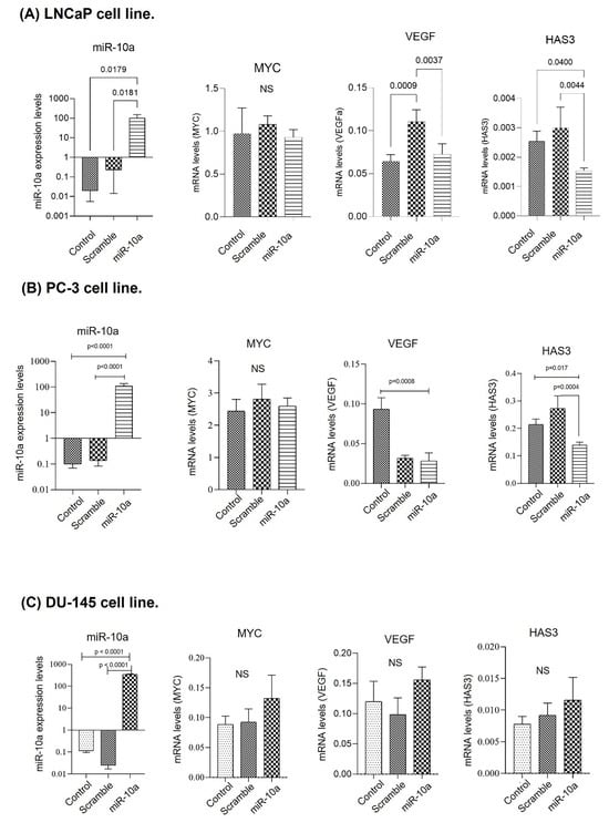 Cell transfection was performed on the LNCaP, PC-3, and DU-145 cell lines. In the LNCaP cell line, the expression of miR-10a was increased when compared to the control (p = 0.01) after transfection, demonstrating the technique’s success. VEGF and HAS3 showed reduced expression (p = 0.003; p = 0.004 respectively), suggesting that they are target genes of miR-10a in this cell line. The MYC gene showed no significant change (Figure 2A). The results of the PC-3 cell line were similar to those of the LNCaP cells, with increased expression of miR-10a when compared to the control group (p < 0.0001), along with reduced expression of VEGF and HAS3 (p = 0.0008; p = 0.017 respectively) but not MYC (Figure 2B). With the DU-145 cells, despite the success of the transfection, there was no significant reduction in the expression of the target genes (Figure 2C).