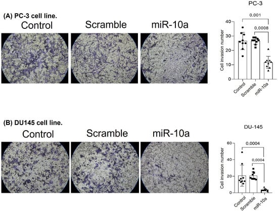 We evaluated if transfection with miR-10a would affect the tumor invasion capacity of PC-3 and DU-145 cells. Cells transfected with miR-10a showed a reduced ability to invade the basal membrane simulated by Matrigel. This effect was observed in the PC-3 (p < 0.001) (Figure 3A) and DU-145 (p = 0.0004) (Figure 3B) cell lines.