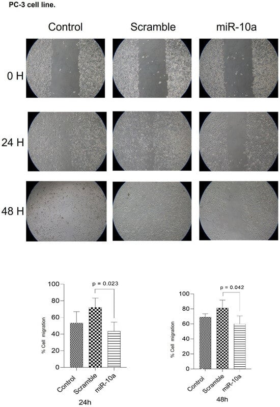 Cell migration assay in PC3 cells after miR-10a overexpression. Wound-healing assay showing the migratory capacity of PC3 cells transfected with miR-10a mimics compared to control groups at 24 and 48 h. The wound area was measured at each time point, and migration was quantified using ImageJ software (NIH, Bethesda, MD, USA).