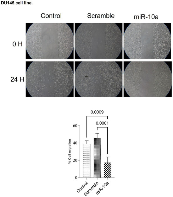 Cell migration assay in DU-145 cells after miR-10a transfection. Wound-healing assay demonstrating the effect of miR-10a overexpression on the migratory capacity of DU-145 cells at 24 h compared to controls. The wound closure area was quantified using ImageJ software (NIH, Bethesda, MD, USA).