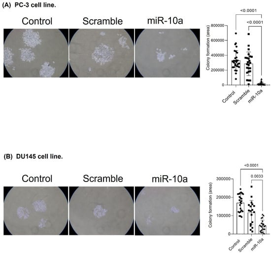We evaluated the influence of miR-10a on cell proliferation through colony formation. In the PC-3 cells, transfection with miR-10a reduced prolife ration potential, resulting in smaller colonies (p < 0.001) (Figure 6A). For the DU-145 cells, we observed similar results, with a reduction in the number and size of colonies in cells transfected with miR-10a (p < 0.001) (Figure 6B).
