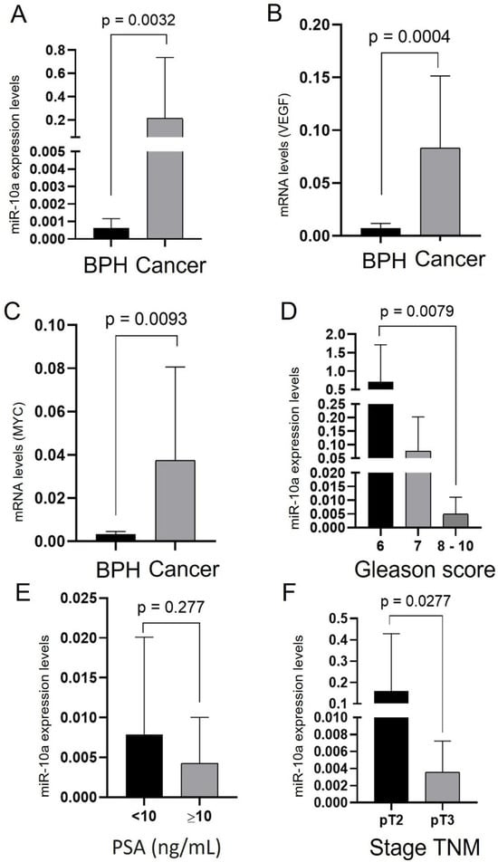 Expression analysis of miR-10a and target genes MYC and VEGF in patient samples. (A) miR-10a expression in BPH and primary PC tissues. (B) VEGF gene expression in BPH and PC samples. (C) MYC gene expression in BPH and PC samples. (D) Comparison of miR-10a expression among Gleason score groups (6–7, and 8–10). (E) miR-10a expression according to PSA levels (<10 vs. ≥10 ng/mL). (F) miR-10a expression between TNM stages pT2 and pT3.