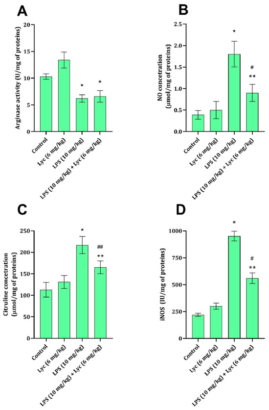 Arginase activity (A), NO concentration (B), citrulline concentration (C), and iNOS activity (D) in rat liver tissue belonging to different experimental groups. Data are shown as mean ± SD (n = 6). One-way ANOVA, followed by Tukey’s post hoc test, * p < 0.001, ** p < 0.01 vs. control; # p < 0.001, ## p < 0.01 vs. LPS-treated animals. LPS—lipopolysaccharide; Lyc—lycopene.