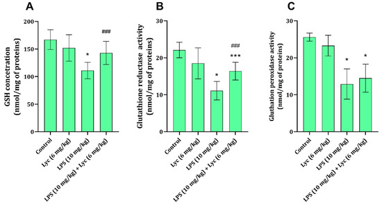 Rat liver tissue GSH (A), GR (B), and GPx (C) activities obtained from different experimental groups. Data are shown as mean ± SD (n = 6). One-way ANOVA, followed by Tukey’s post hoc test, * p < 0.001, *** p < 0.05 vs. control; ### p < 0.05 vs. LPS-treated animals. LPS—lipopolysaccharide; Lyc—lycopene.