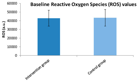 Reactive Oxygen Species (ROS) mean values ± SD in intervention and control groups before intervention.