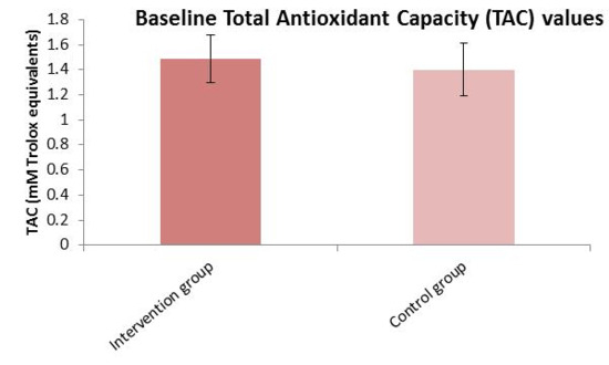 Total Antioxidant Capacity (TAC) mean values ± SD in intervention and control groups before intervention.