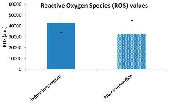 Reactive Oxygen Species (ROS) mean values ± SD before and after intervention in the study group.