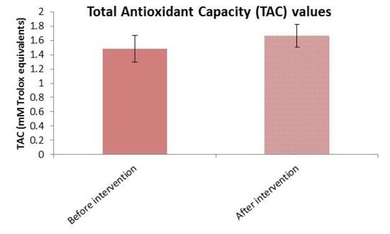 Total Antioxidant Capacity (TAC) mean values ± SD before and after intervention in the study group.
