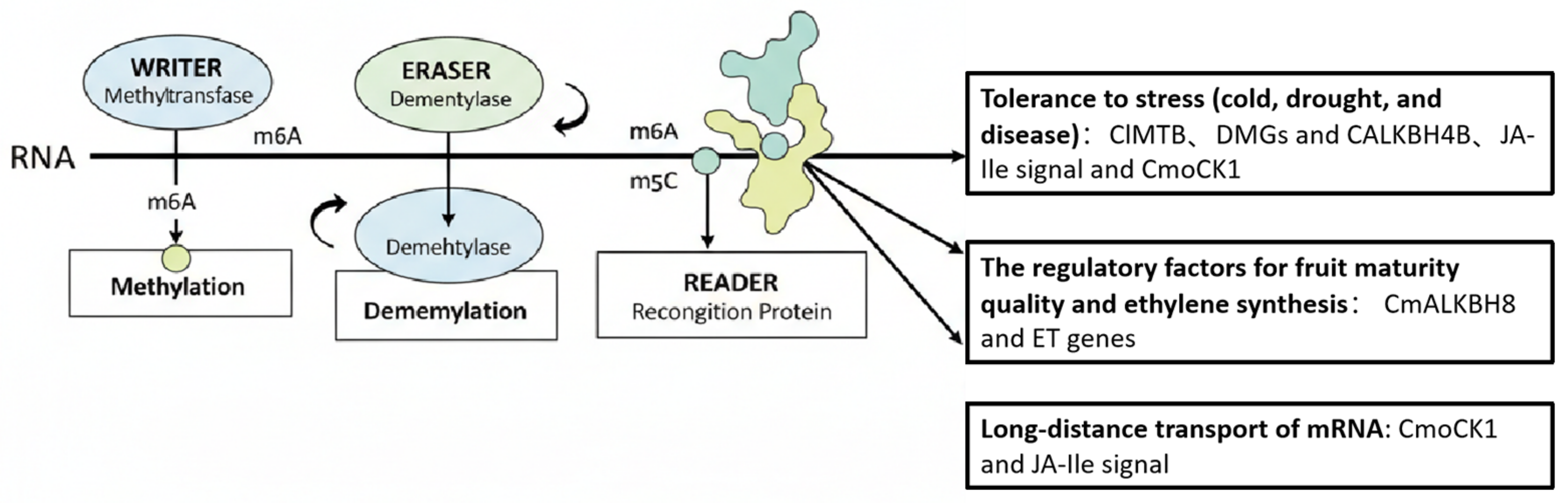 Figure 1. The regulatory role of RNA methylation in the growth, development and stress response of Cucurbitaceae plants. Note: RNA methylation is dynamically regulated by three types of proteins: ‘writers’ (methyltransferases) add methyl marks on RNA as annotations; ‘erasers’ (demethylases) remove these marks; and ‘readers’ (recognition proteins) interpret these marks to determine the fate of RNA, such as its stability, translation or cellular localization. The arrows indicate the “direction of action” or “regulatory flow”. The system shows the process from the enzymatic modification of RNA, to the recognition of the modified sites by recognition proteins, and then to the regulation of specific physiological functions. The arrows pointing from the READER to the three text boxes below indicate that recognition proteins regulate the following biological processes by specifically recognizing RNA methylation modifications: stress tolerance (such as low temperature, drought, and disease), fruit ripening quality, ethylene synthesis, and long-distance transport of mRNA.
